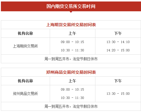 商品期货上午开盘比股票早半个小时,9点开盘;下昼开盘比股票晚半个小时,1点半开盘。收盘年光一律。