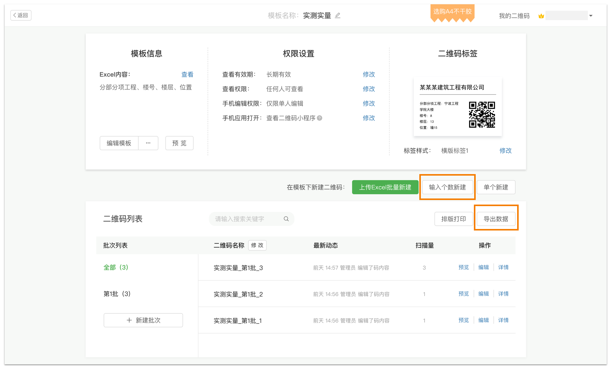 批量二维码性能撑持【输入个数】神速新修一批类似的空码,实质填写完毕后,可能一键导出所罕睹据,查看详情