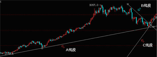 图1-4 伦敦铜日线走势图如图中A线段所示,长远趋向为上升趋向。如图中B线段所示,中期趋向为消浸趋向。如图中C线段所示,短期趋向为上升趋向。