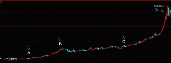 图1-5 伦敦铜周线走势图 AB段是冲破长达一年的盘整区后变成的上升趋向初期,BC段为上升流程中的横盘修改阶段,CD段是上升趋向的延迟阶段,也即末期。