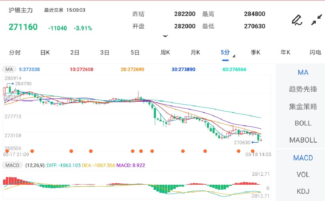 5月18日期货软件走势图综述:沪锡期货主力跌3