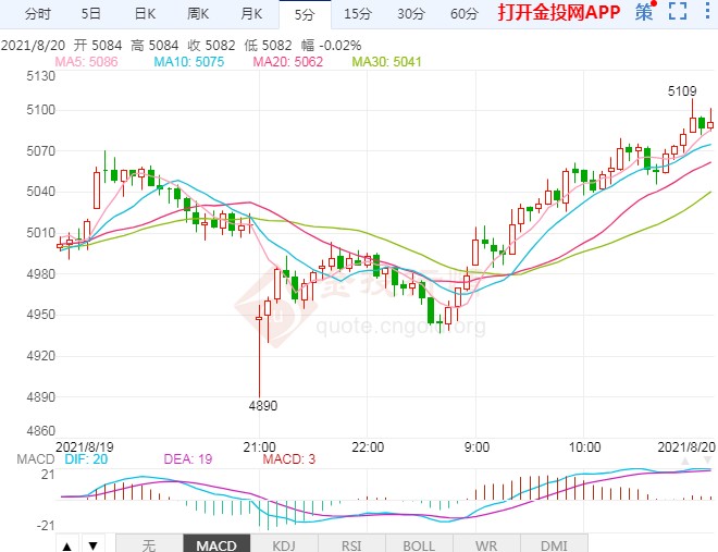 8月20日,螺纹钢期货2201合约早盘波动走强,午收5093元/吨涨1.51%。