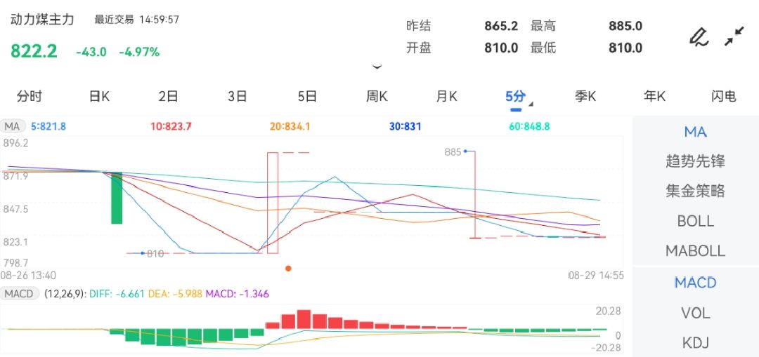 8月29日期货软件走势图综述:动力煤期货主力跌497%金投网APP行情中央数据显示,截止2022年8月29日下昼15:00收盘,动力煤期货主力合约行情音信:最新价:822.2,涨跌:-43.0,涨跌幅:-4.97%,成交量:39手,开盘价:810.0,昨收价:831.4,最高价:885.0,最低价:810.0。